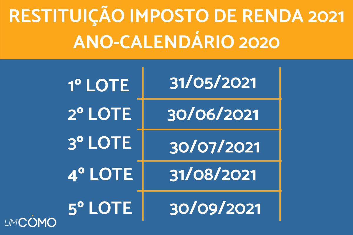 A restituição do imposto de renda é feita divida em cinco lotes. Sendo que no primeiro lote ficam idosos, pessoas com deficiência e professores e nos demais lotes as demais pessoas por ordem de entrega da declaração. Este ano, as restituições começam em maio e terminam em setembro. Fique de olho para saber quando será feita a sua.