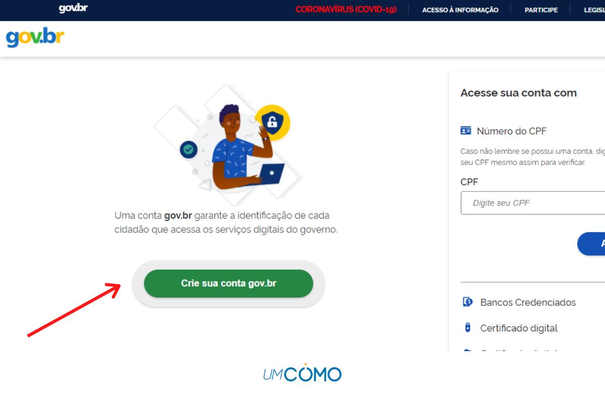 Primeiramente, você deve acessar o site do Governo Federal para criar uma conta, caso você ainda não seja cadastrado. Para isso, basta clicar em crie sua conta gov.br, como se vê na imagem.