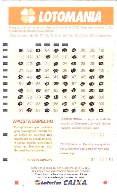 Você compra um cartão da Lotomania por apenas R$1,50 e realiza uma aposta única nele. Pode fazer sua aposta de diferentes formas: marcando 50 números, marcando menos e deixando o sistema escolher os restantes, deixando o sistema escolher todos os números (método chamado de "surpresinha") ou concorrer com a mesma aposta durante vários concursos consecutivos (chamado de "teimosinha").