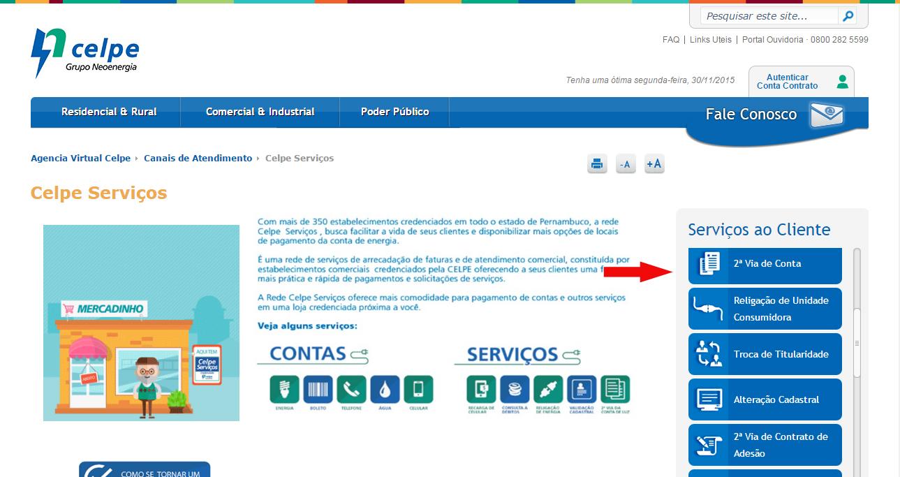 - Para começar, no site da CELPE, acesse a página de serviços.Você pode acessá-la diretamente através desse link.