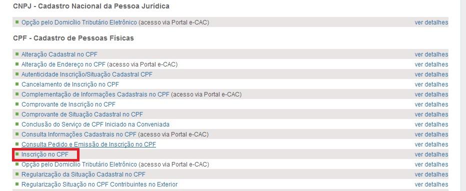 Na lista que lhe aparecerá, vá a CPF - Cadastro de Pessoas Físicas e clique em "Inscrição no CPF". Tal como indica a imagem.
