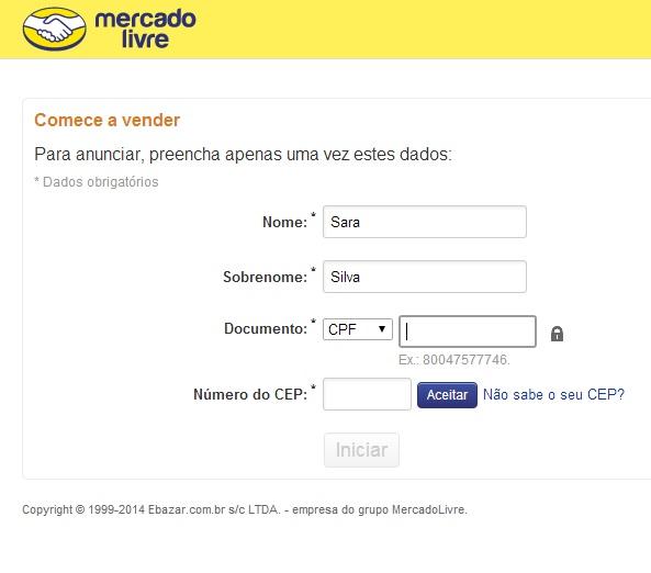Para vender no Mercado Livre, você terá de preencher alguns dados extra que o permitirão ser um usuário vendedor. Para isso clique em "Vender" na mesma barra amarela onde anteriormente carregou para se cadastrar. Preencha os espaços com suas informações pessoais.