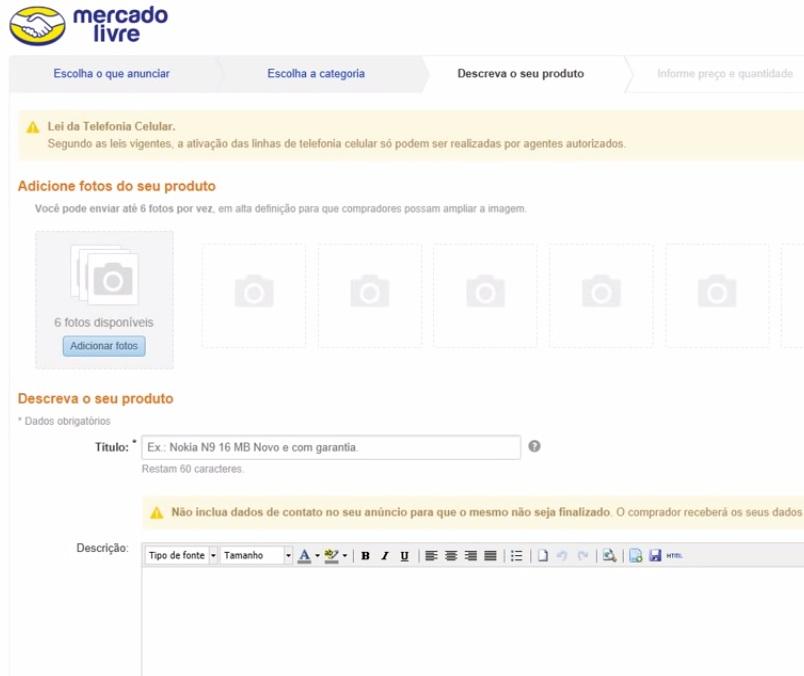 Quando tiver terminado de enquadrar seu produto nas categorias indicadas, o passo seguinte é formular o anúncio com as informações que reuniu anteriormente. Adicione mais de duas fotografias de forma a que o público possa conhecer bem o produto e descreva-o pormenorizadamente no campo de texto. O título do anúncio é muito importante pois é o que, juntamente com as fotografias, irá chamar a atenção dos compradores num primeiro momento. Escolha palavras chave que definam o produto que pretende vender, por exemplo: celular samsung galaxy ace preto novo.