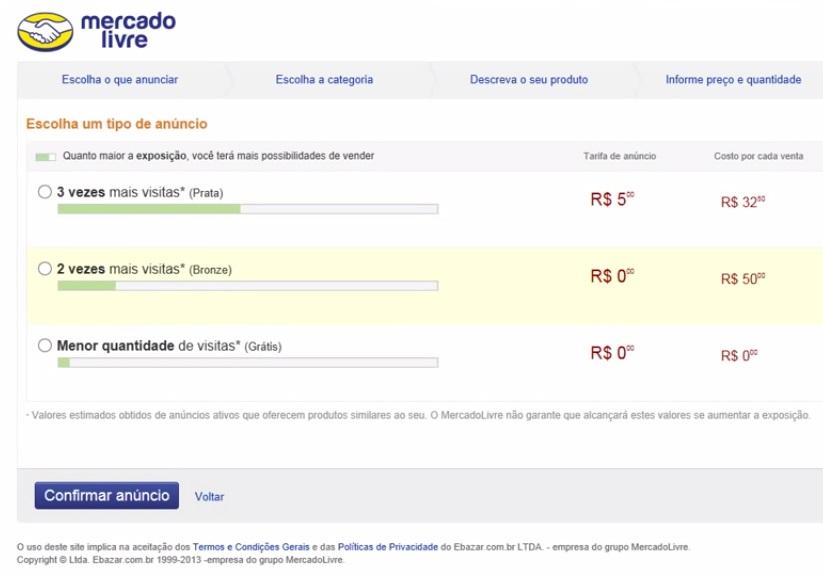 Dê uma checada em todos os campos que preencheu e certifique-se de que toda a informação importante está referida. Imagine-se como um comprador: está vendo todos os dados que gostaria de saber acerca do produto que está tentando vender? Se sim, avance para definir o preço do artigo e escolher o tipo de anúncio que pretende. Nesta fase, quanto mais pagar pelo anúncio do seu produto, mais tempo ele estará online e mais visibilidade terá, semelhante ao que acontece quando estamos criando um anúncio para o Facebook.