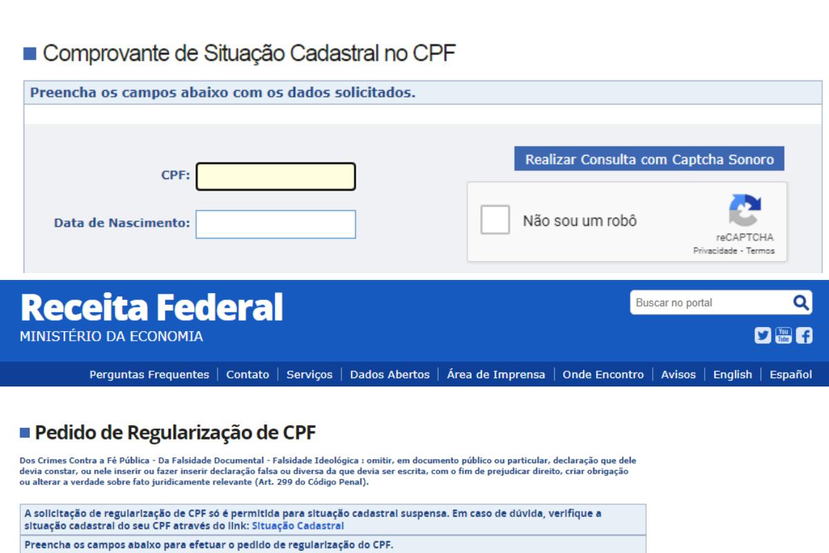 - RECEITA FEDERAL. Regularização CPF. Disponível em: <https://receita.economia.gov.br/orientacao/tributaria/cadastros/cadastro-de-pessoas-fisicas-cpf/servicos/regularizacao-cpf>. Publicado em 08 de junho de 2016. Acesso em 05 de agosto de 2020.