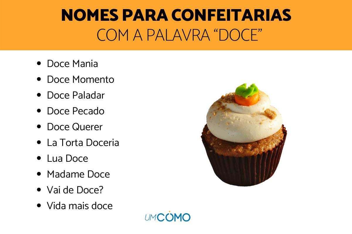 Nos últimos anos surgiram uma série de confeitarias especializadas em cupcakes. Há opções frutados, de nutela, doce de leite e muito mais. Aqui separamos algumas sugestões de nomes que você pode usar ou se inspirar:
